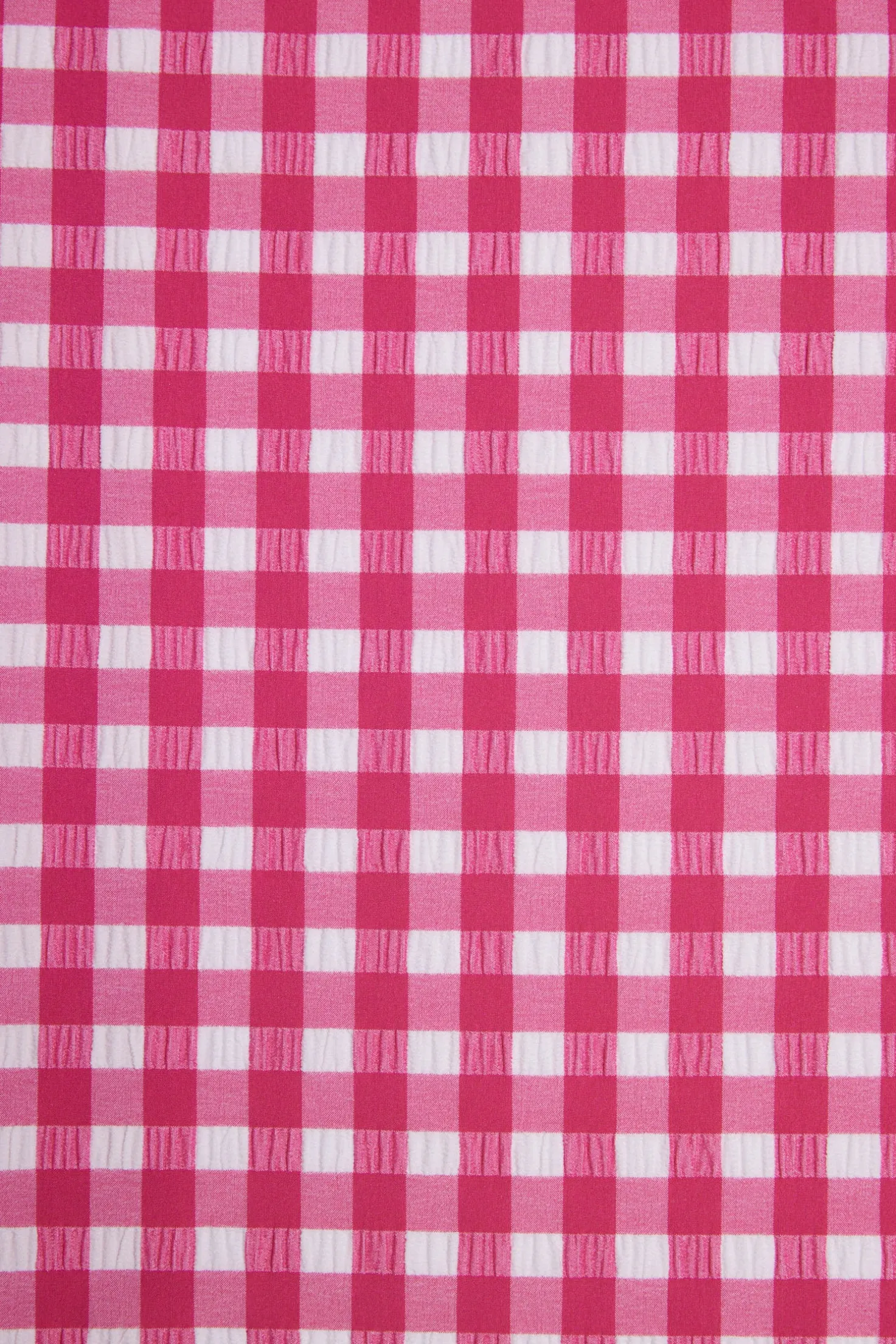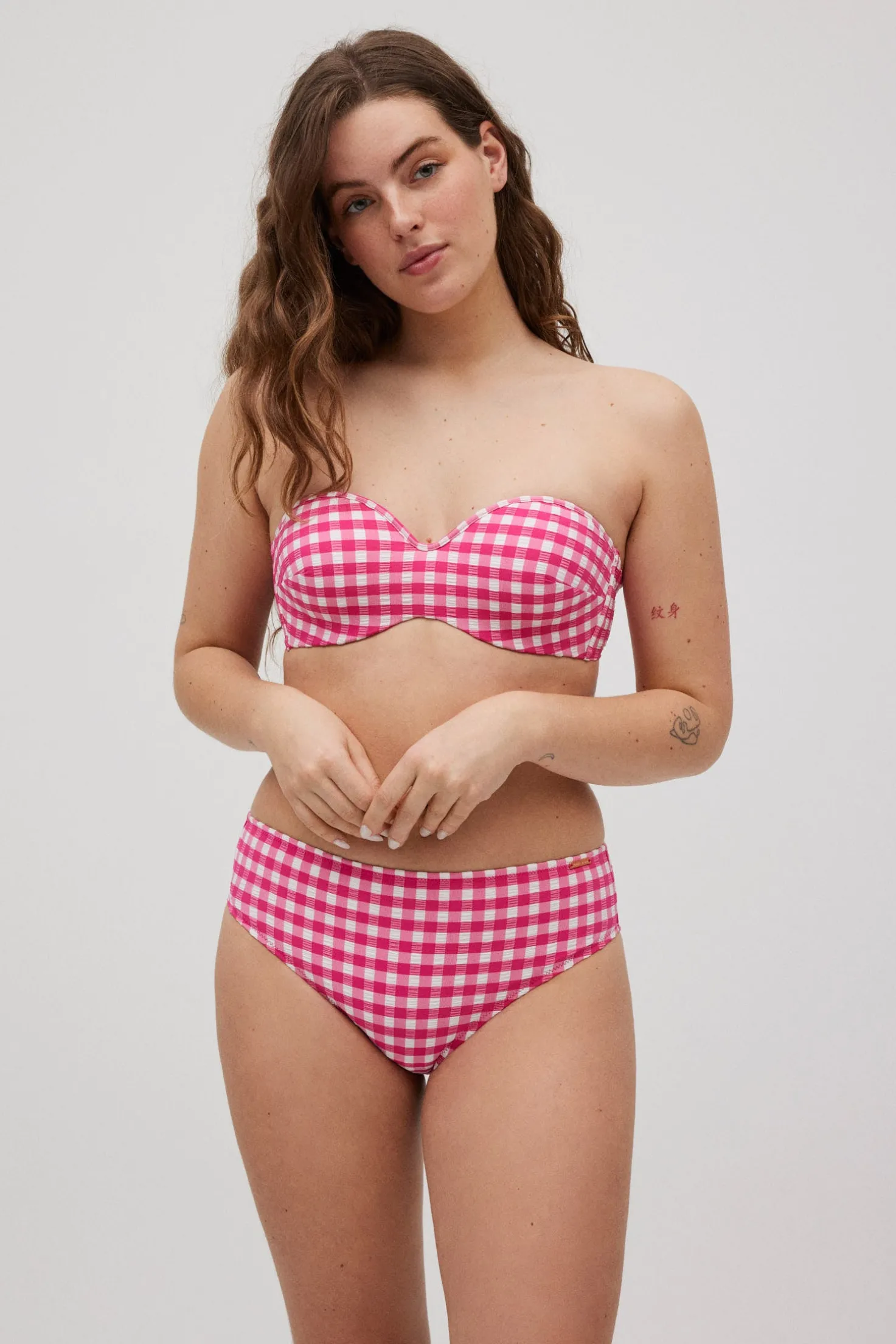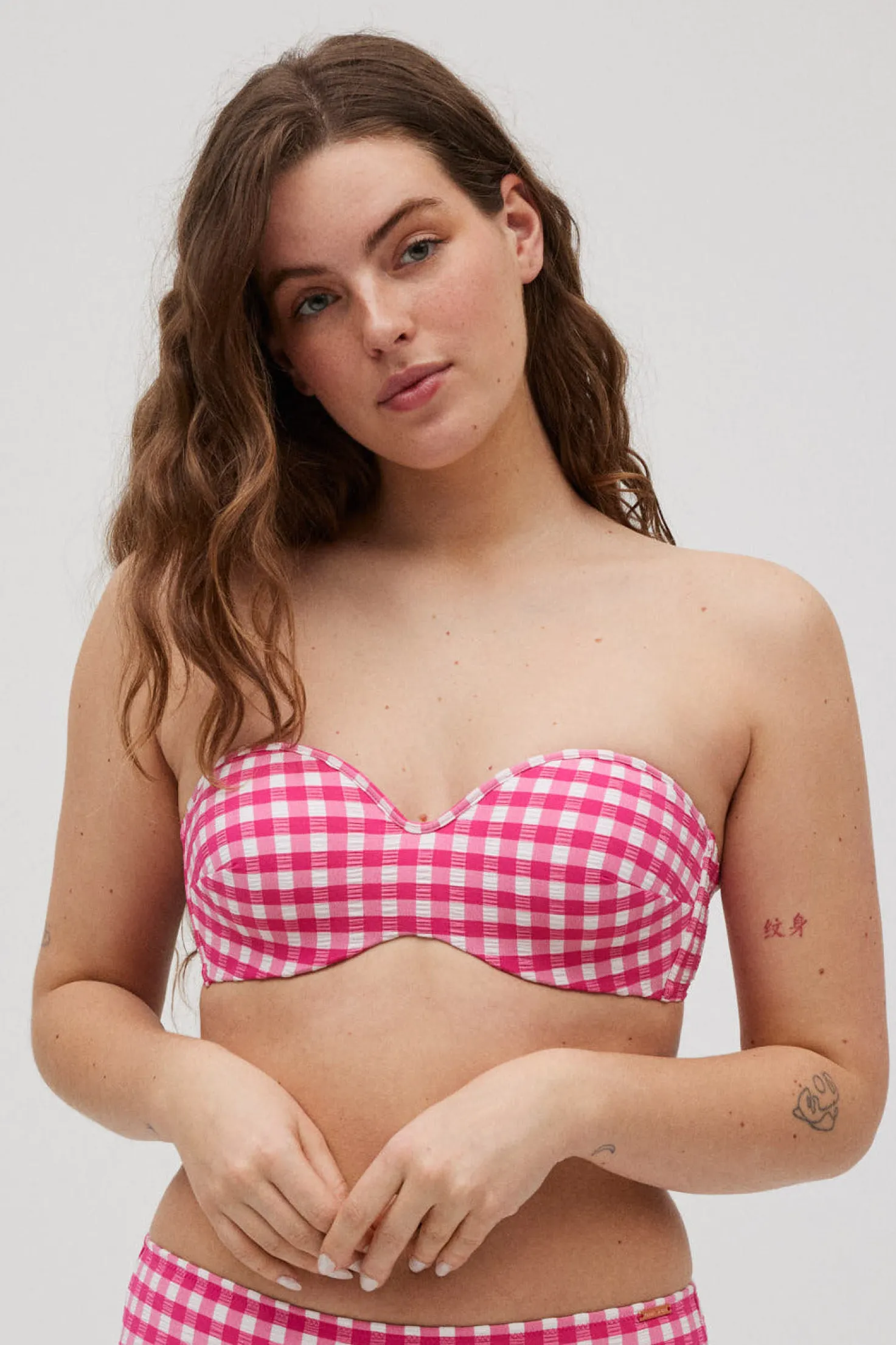 Realza tu estilo este verano con nuestro top de bikini bandeau, con tirantes desmontables anudados al cuello. Su estampado de cuadro vichy añade un toque fresco a tus días de playa o piscina.
