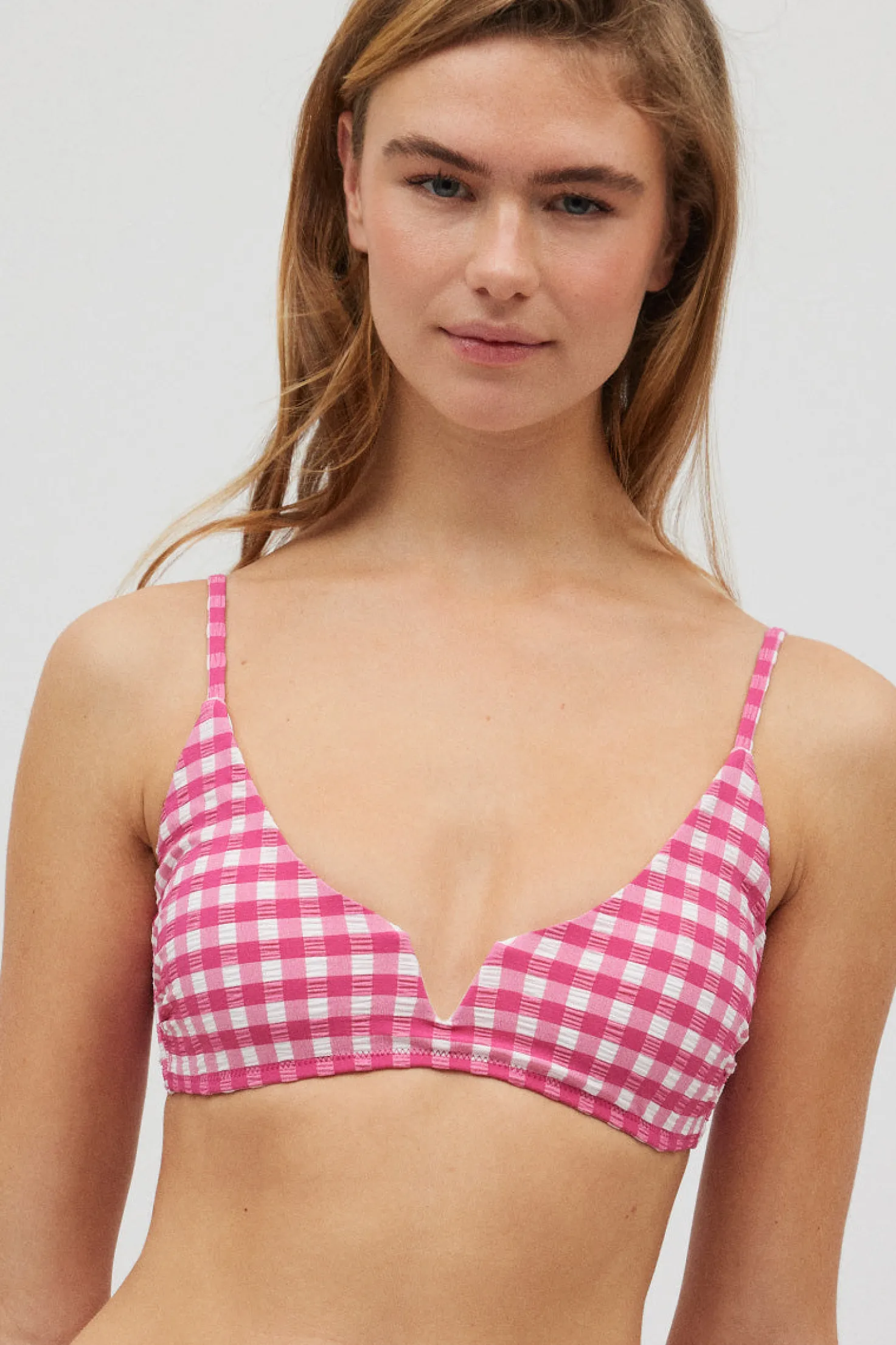 Realza tu estilo este verano con nuestro top de bikini triángulo, diseñado para ajustarse a la perfección y ofrecer comodidad en cada movimiento. Su estampado de cuadro vichy añade un toque fresco a tus días de playa o piscina.