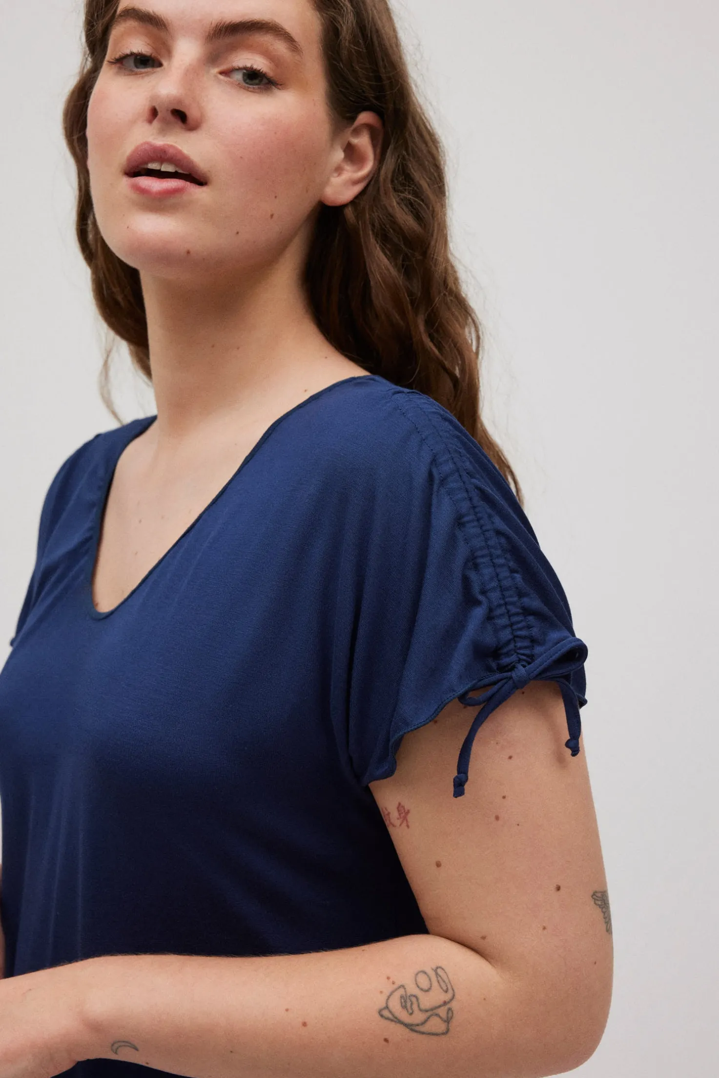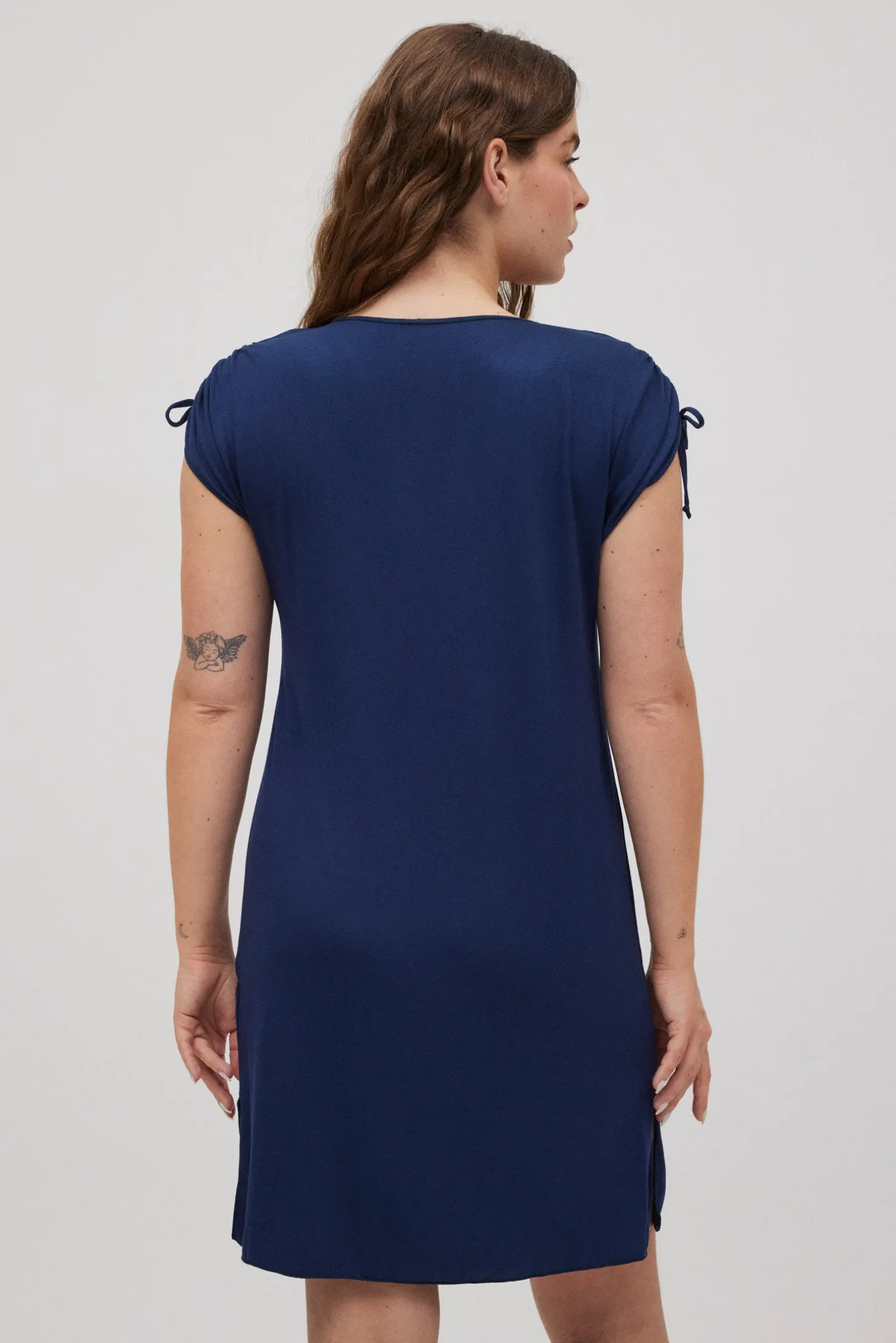 Vestido corto de manga corta. Detalle en las mangas para poder ajustarlas. Liso, de color azul marino. Prenda básica para este verano. Combínala con un bikini o bañador de la colección.