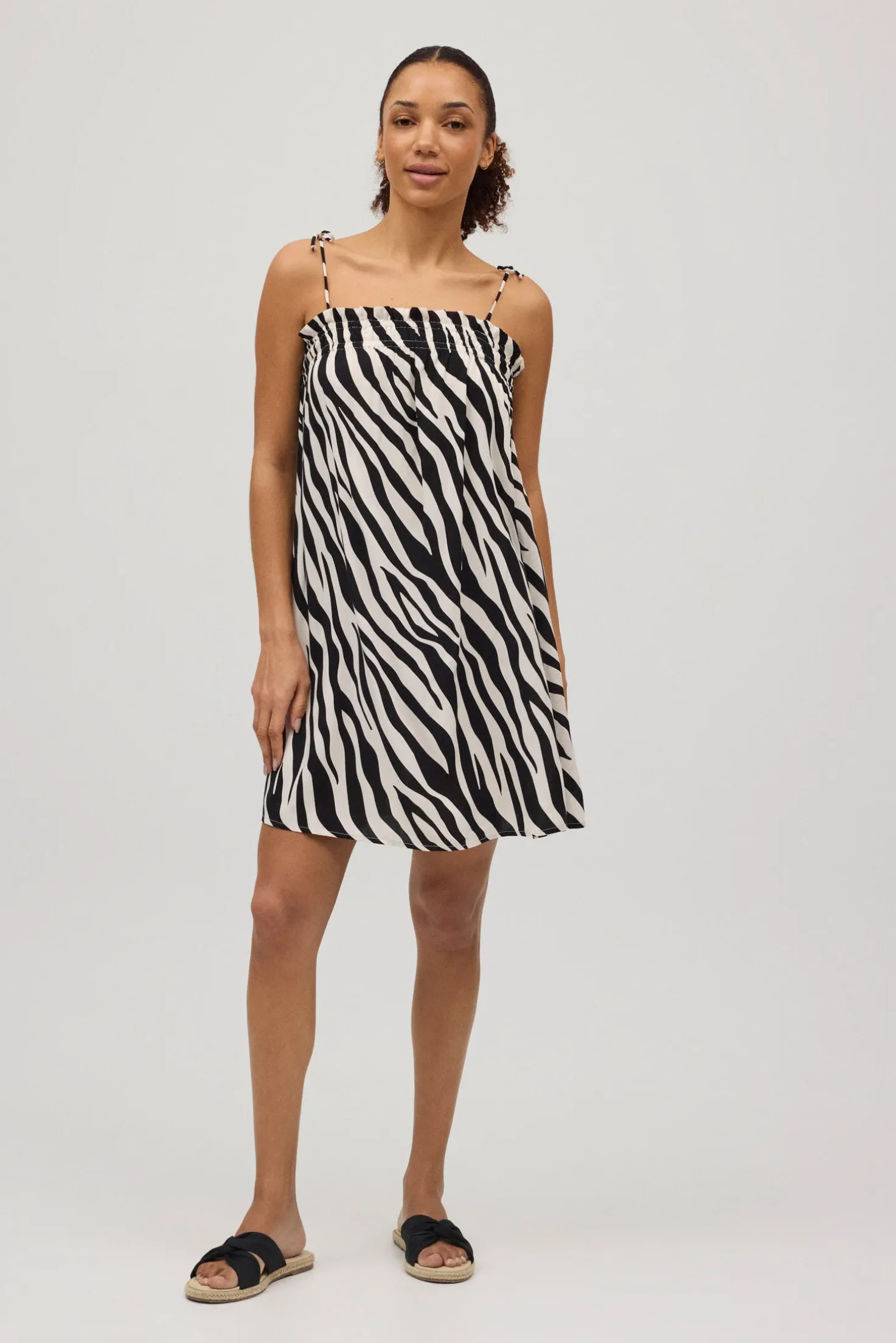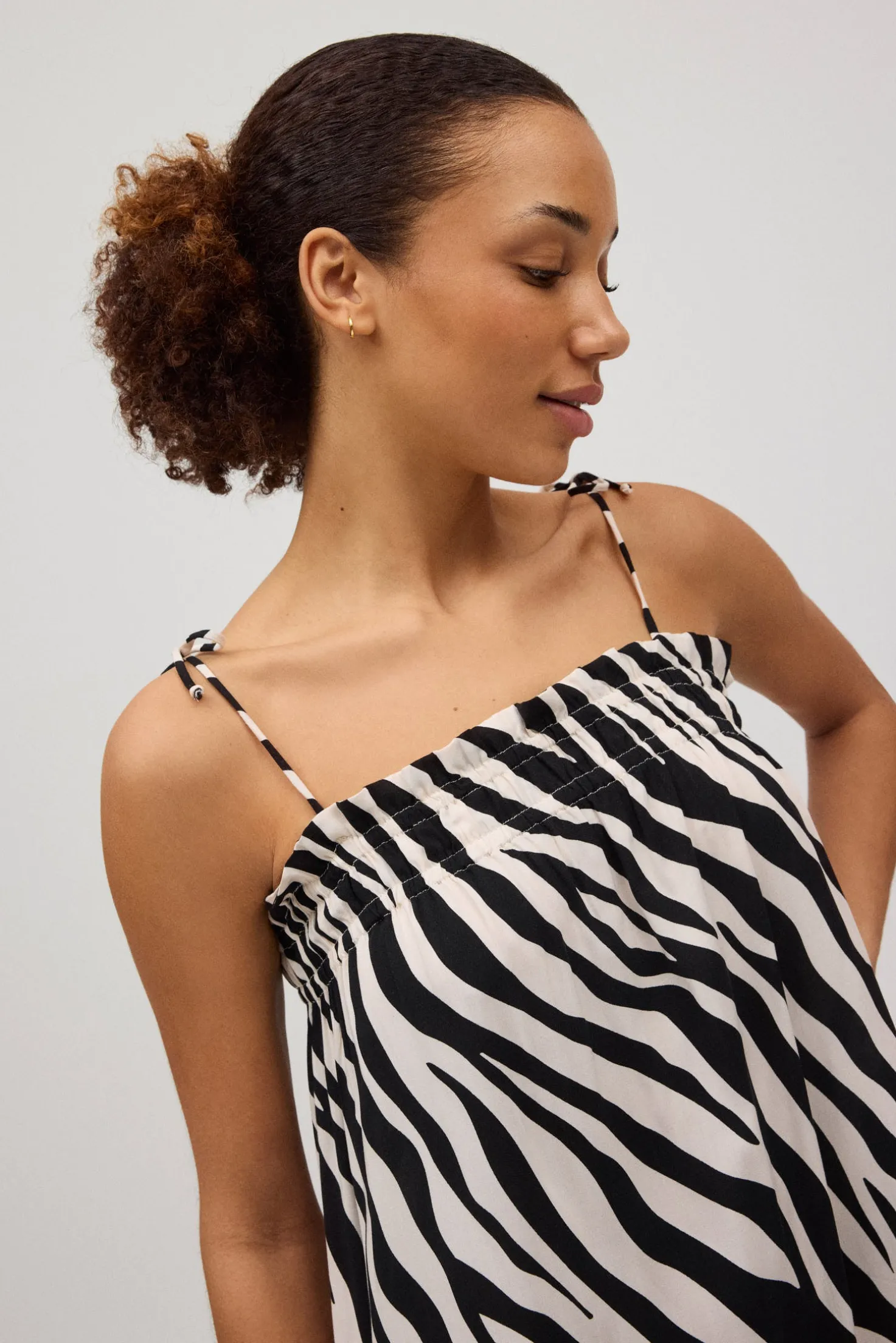Vestido con tirantes anudados y estampado de cebra. Fruncido en la parte superior del vestido para un aspecto diferente y original a la prenda. Tirantes anudados para ajustar el vestido a la medida deseada. Tejido fresco y ligero, perfecto para los días cálidos de verano. Combínalo con alguna prenda de la colección y completa tu look.