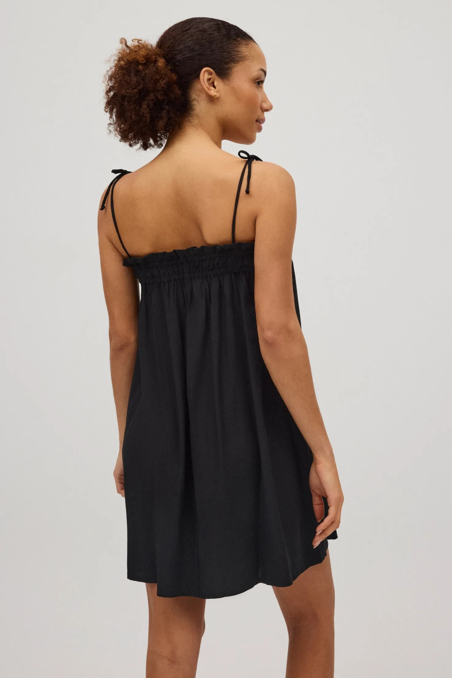 Vestido con tirantes anudados en color negro. Fruncido en la parte superior del vestido para un aspecto diferente y original a la prenda. Tirantes anudados para ajustar el vestido a la medida deseada. Tejido fresco y ligero, perfecto para los días cálidos de verano. Combínalo con alguna prenda de la colección y completa tu look.