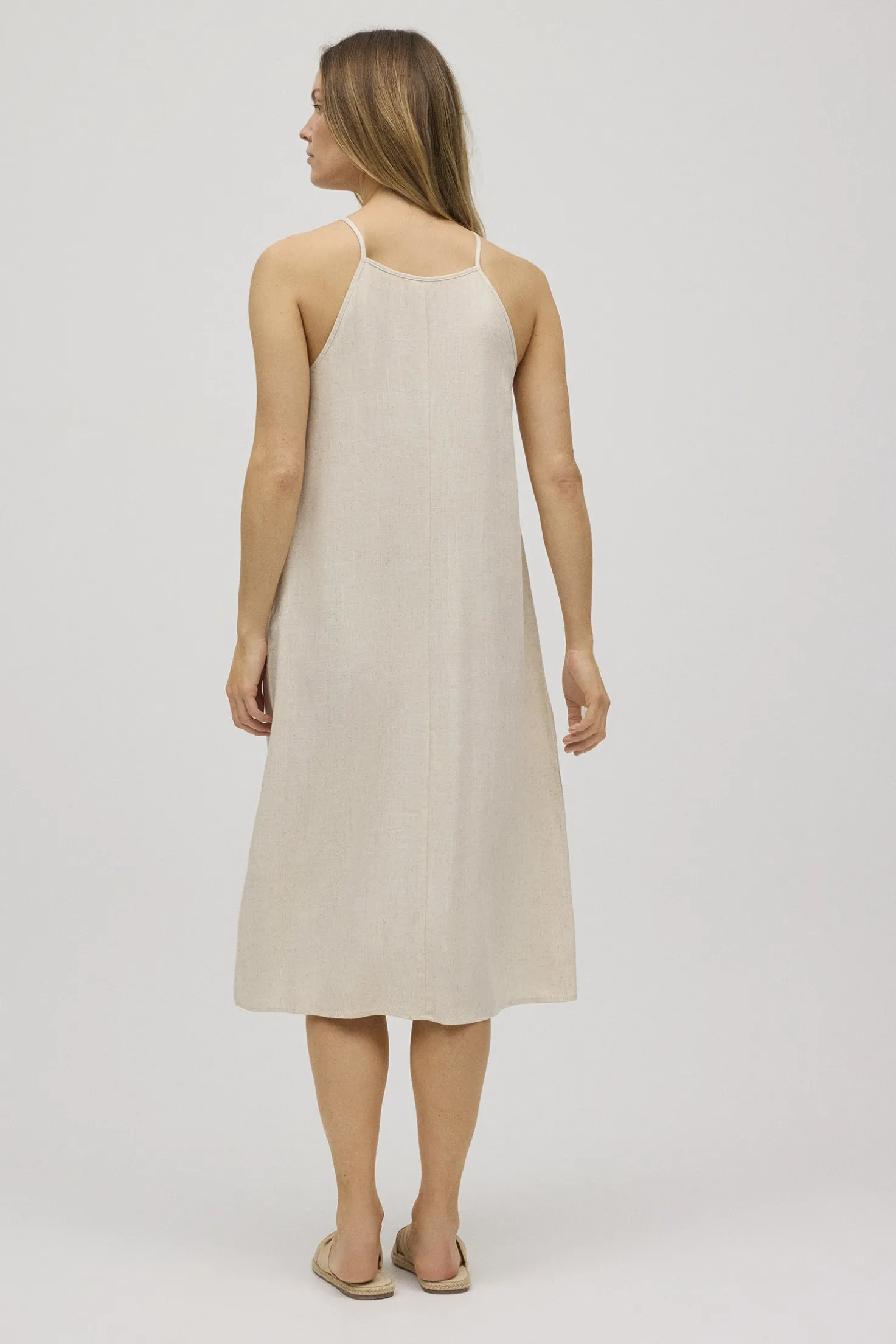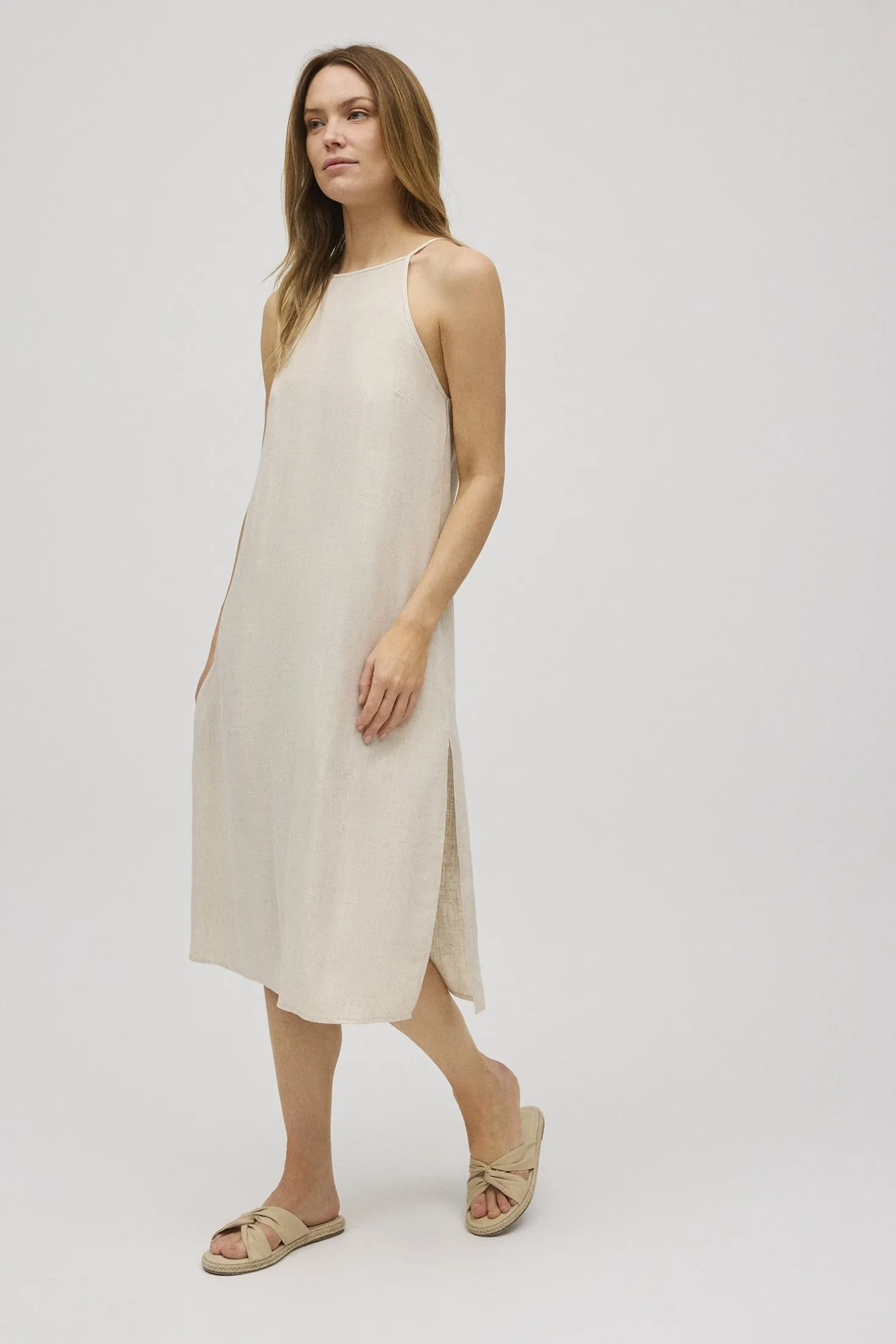 Vestido midi de lino de tirantes. De corte recto para sentirse lo más comoda posible este verano. Combínalo con unas sandalias y un bolso de la colección para completar el look.