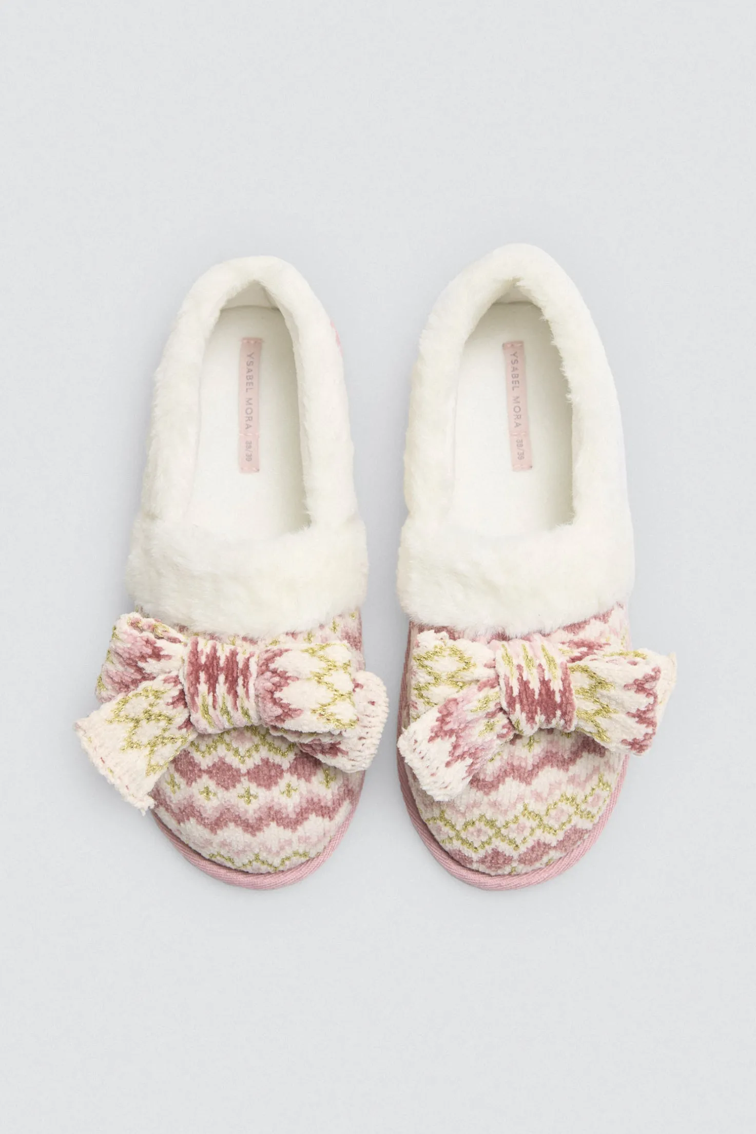 Estas zapatillas, con un elegante estampado étnico y un lazo decorativo, combinan confort y estilo. El suave interior de pelo garantiza que tus pies se mantengan cálidos y cómodos durante todo el día.