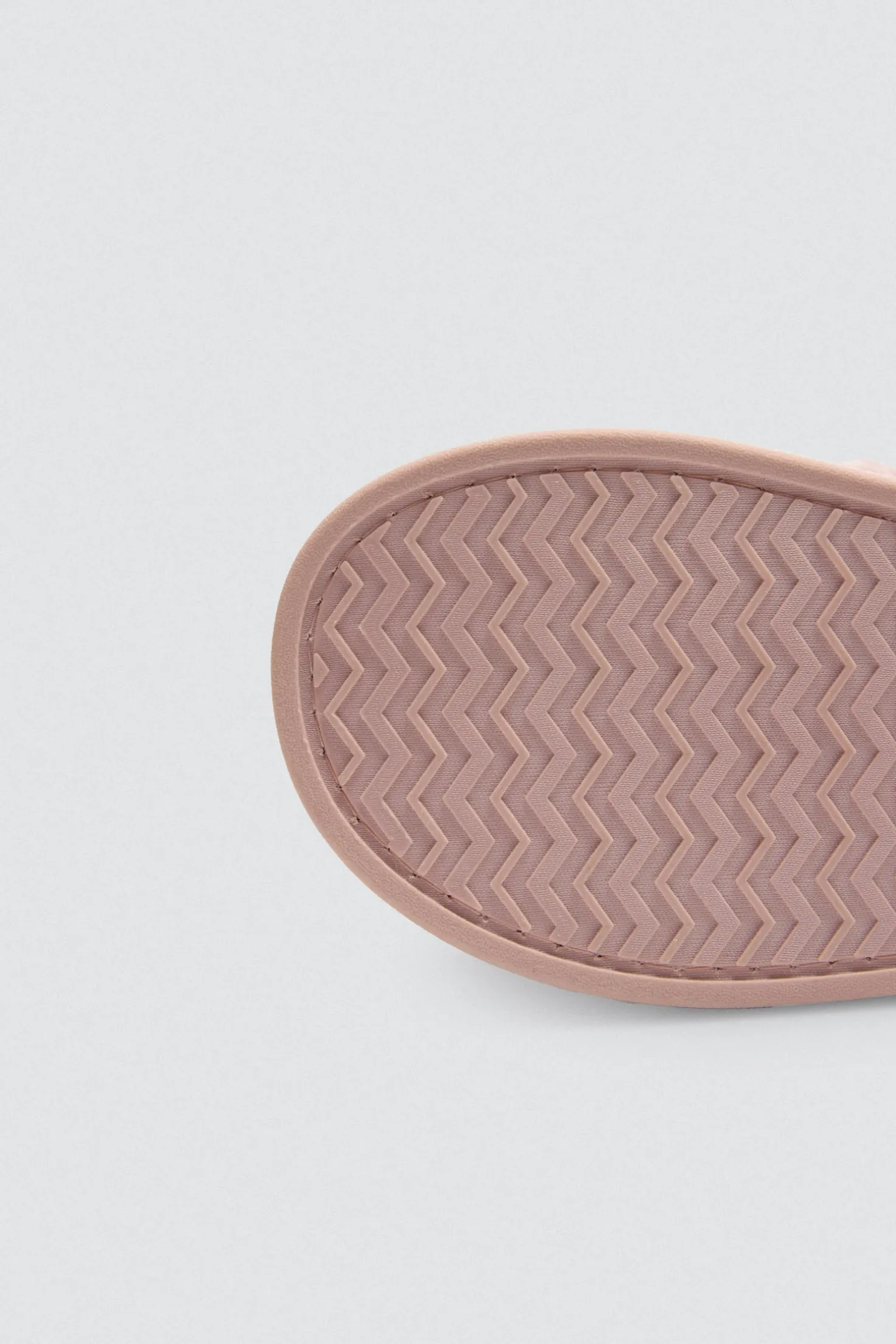 Estas zapatillas de casa de color rosa suave son la combinación perfecta entre confort y ternura. Con detalles de pelo en el borde y pequeñas «orejas» que dan un toque especial, son ideales para mantener tus pies abrigados y cómodos. Su diseño sencillo y femenino las convierte en un must para las tardes de relax.