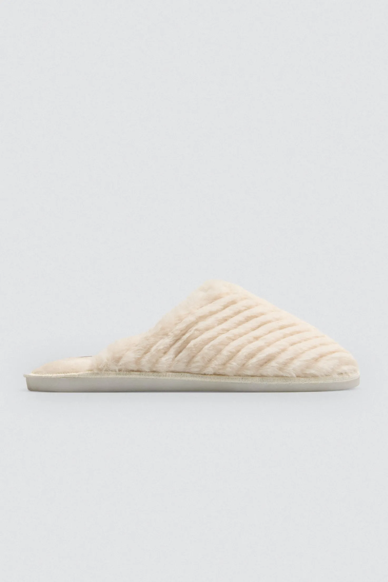 Zapatilla de casa con exterior e interior de pelo efecto canalé en tono crudo.